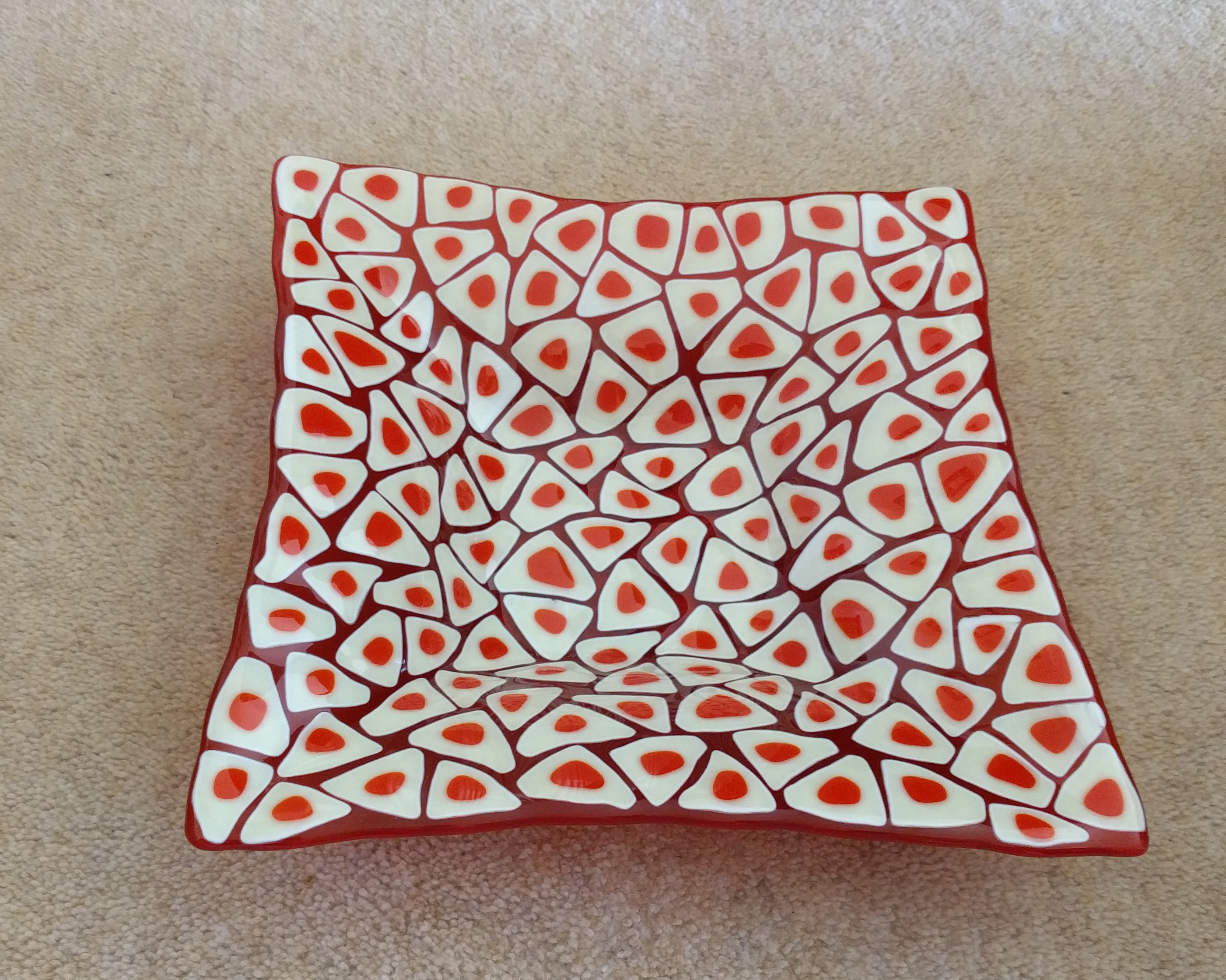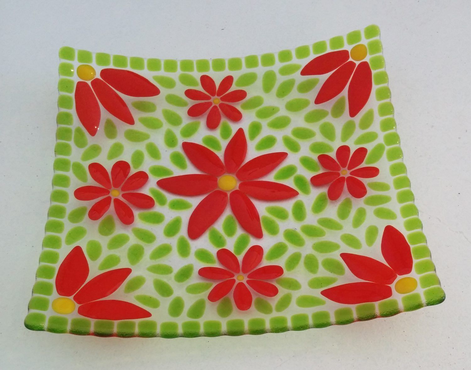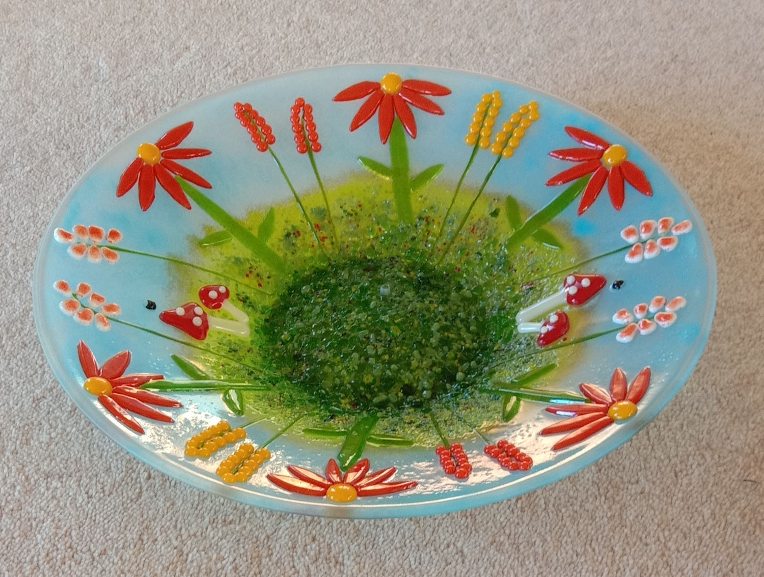 I just lay down pieces until I’m happy with the design. More flowers were added. The centre was filled using a mixture of different size and coloured frit. All the ends of the flower stems were covered up. Two butterflies can also be found flitting about above the toadstools. I found these butterflies on the internet and they’re part of my stash – to be used sparingly.